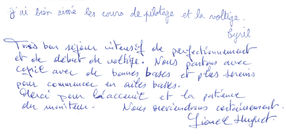 Lors d'un stage dans notre école, nous sommes à votre disposition tout au long de la formation. Cette disponibilité permet d'aborder toutes les phases de la pratique et de la technique